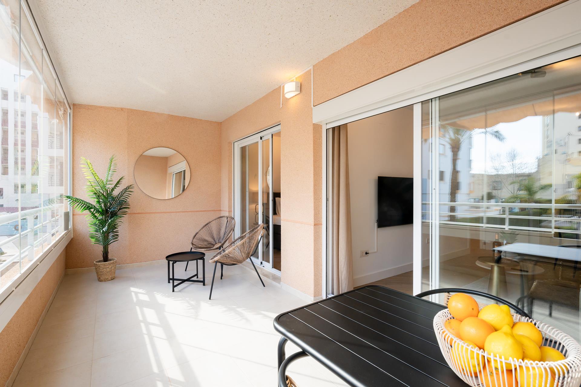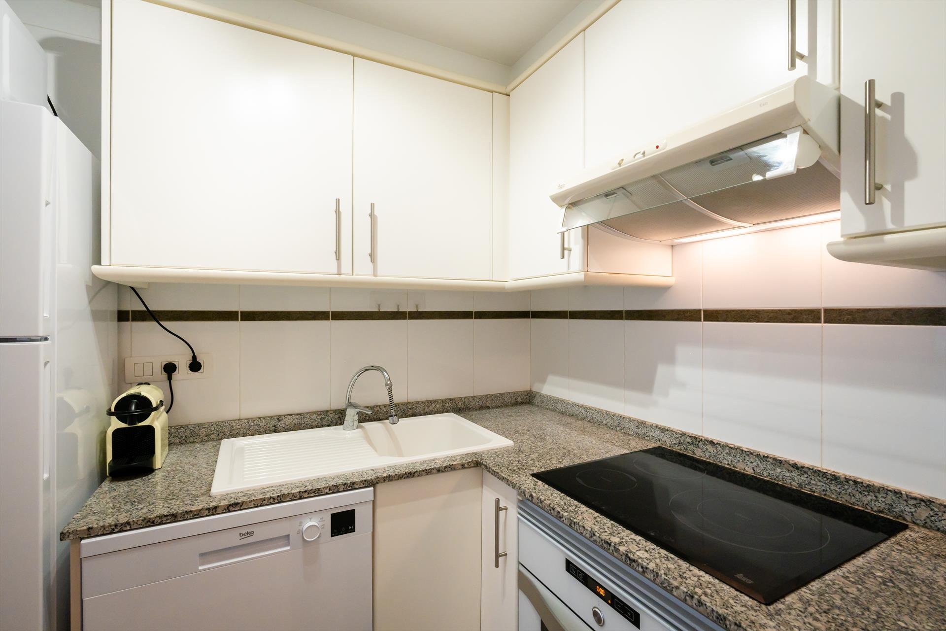 El apartamento de vacaciones tiene 2 dormitorios y 1 cuarto de baño. El alojamiento ofrece un jardín con césped, un jardín comunitario con césped, unas maravillosas vistas a la bahía y al mar y unas bonitas vistas a la piscina, al jardín y a otros edificios. La cercanía de la playa, sitios para salir, actividades deportivas, zonas de entretenimiento y lugares para ir de compras hace de este apartamento un alojamiento apropiado para pasar sus vacaciones en España con familia o amigos.