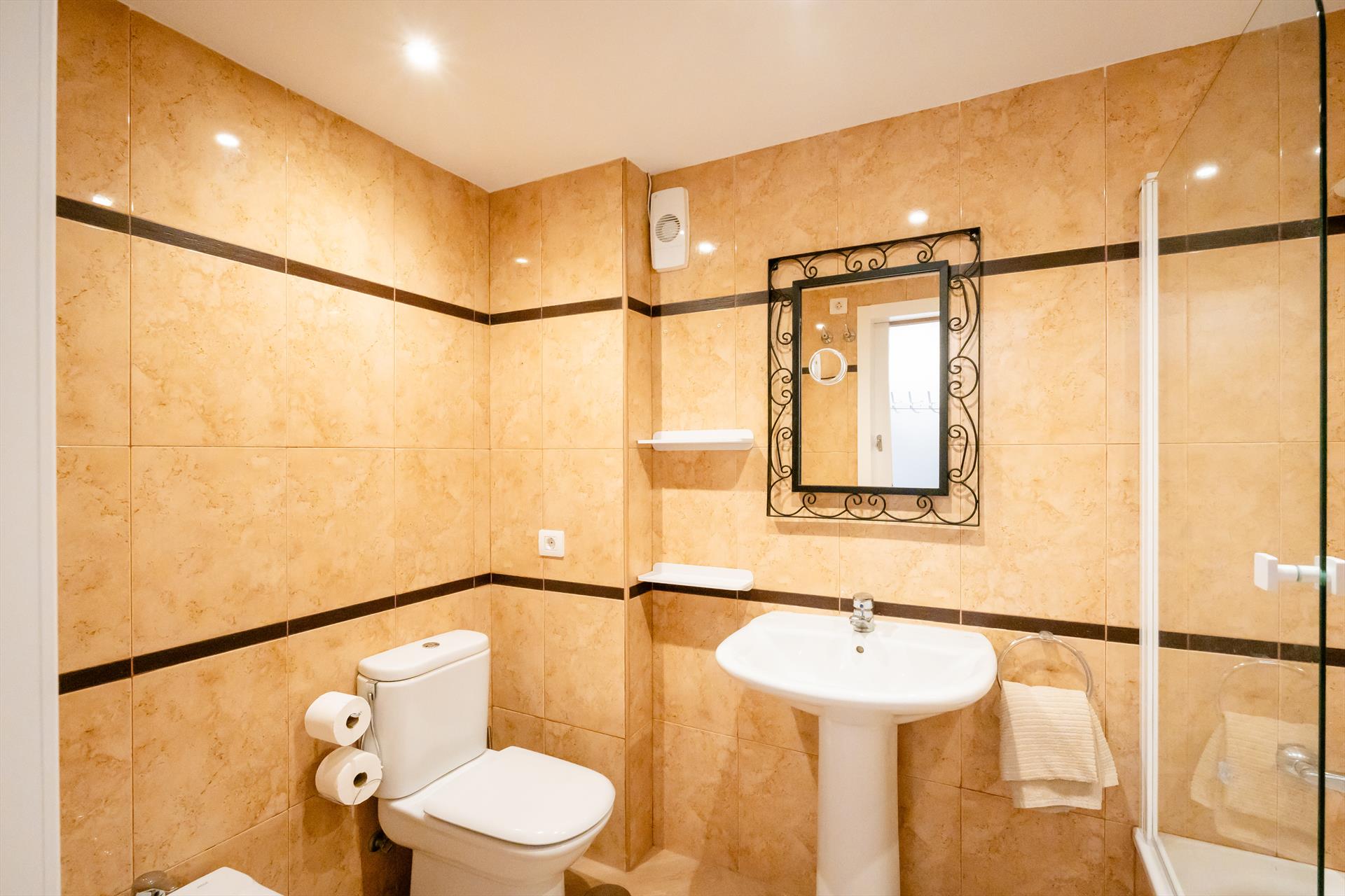• cuarto de baño con lavabo, ducha, water y secadora de pelo