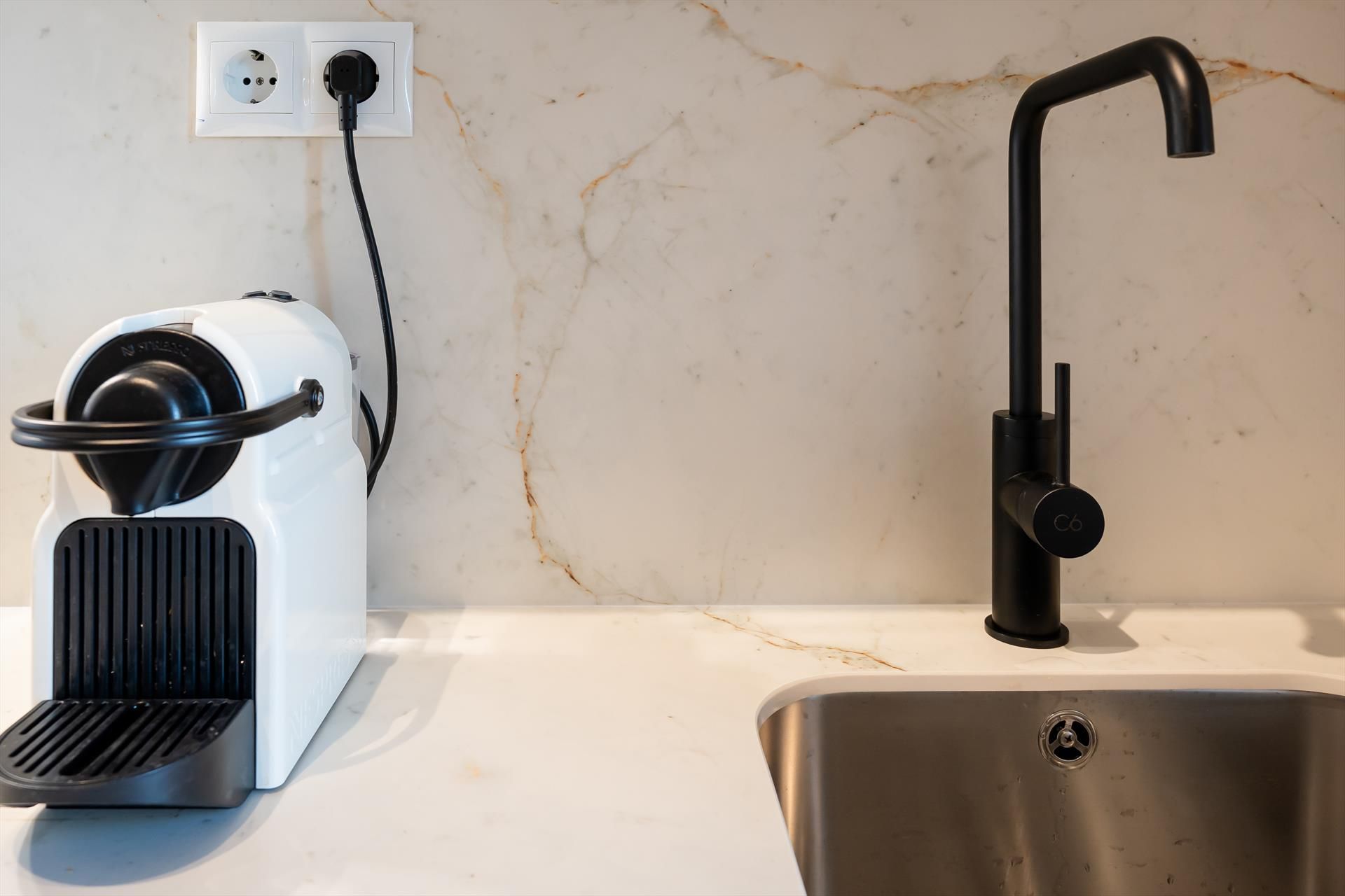- cocina con cocina eléctrica, horno eléctrico, microondas, frigorífico, congelador, cafetera, calentador de agua y tostador