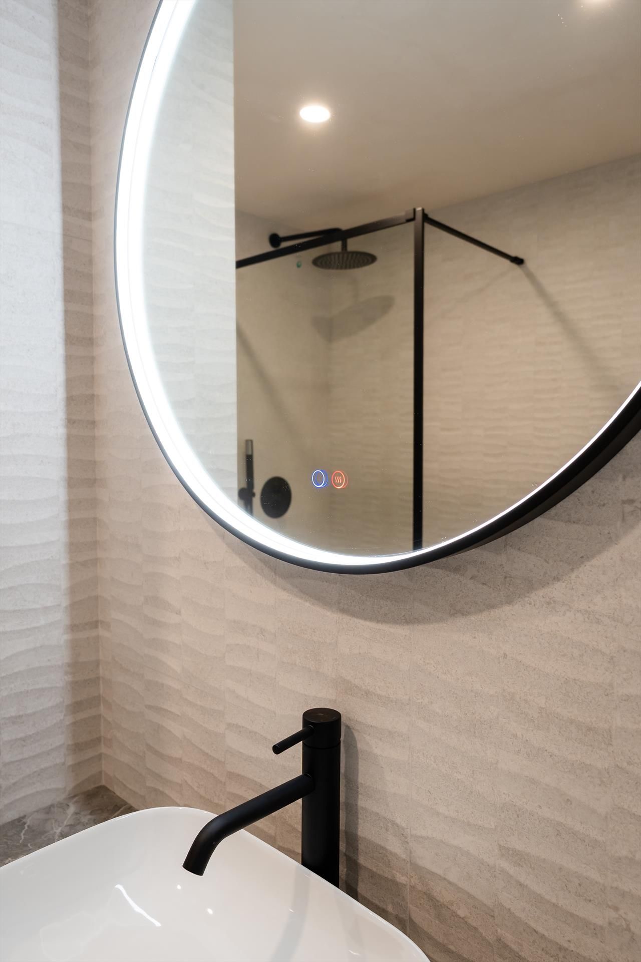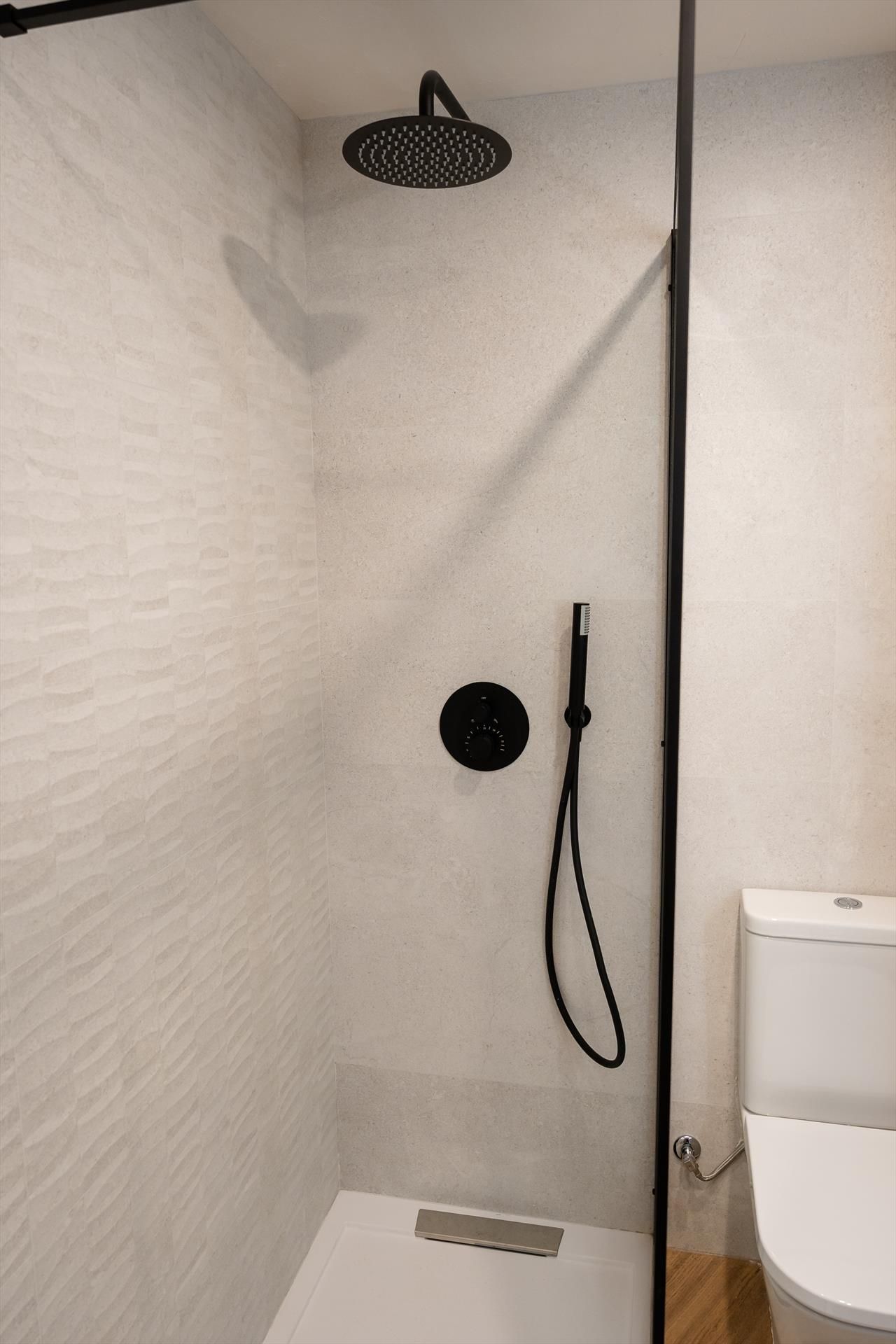 - cuarto de baño con lavabo, ducha, water y secadora de pelo