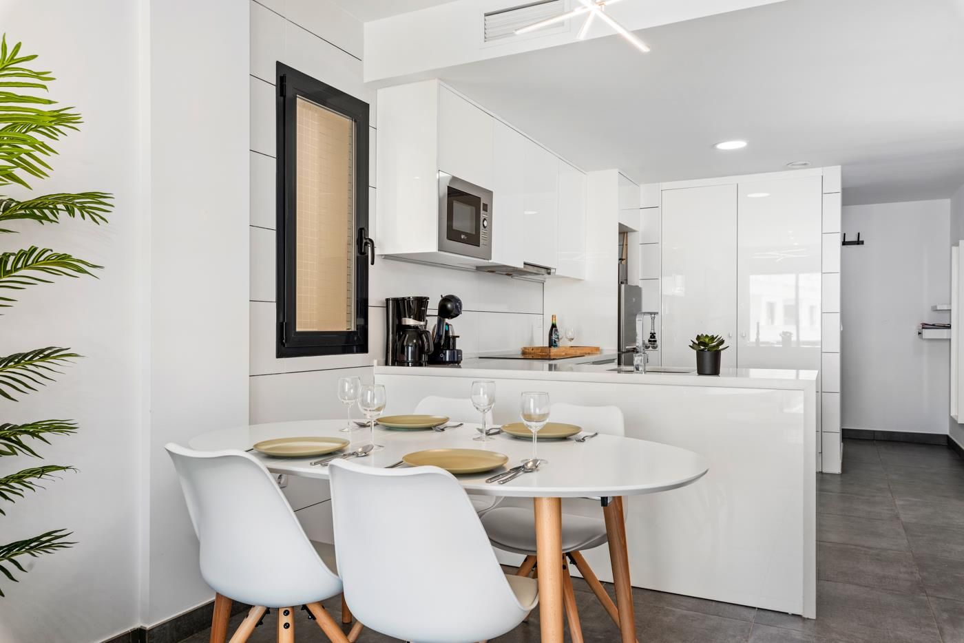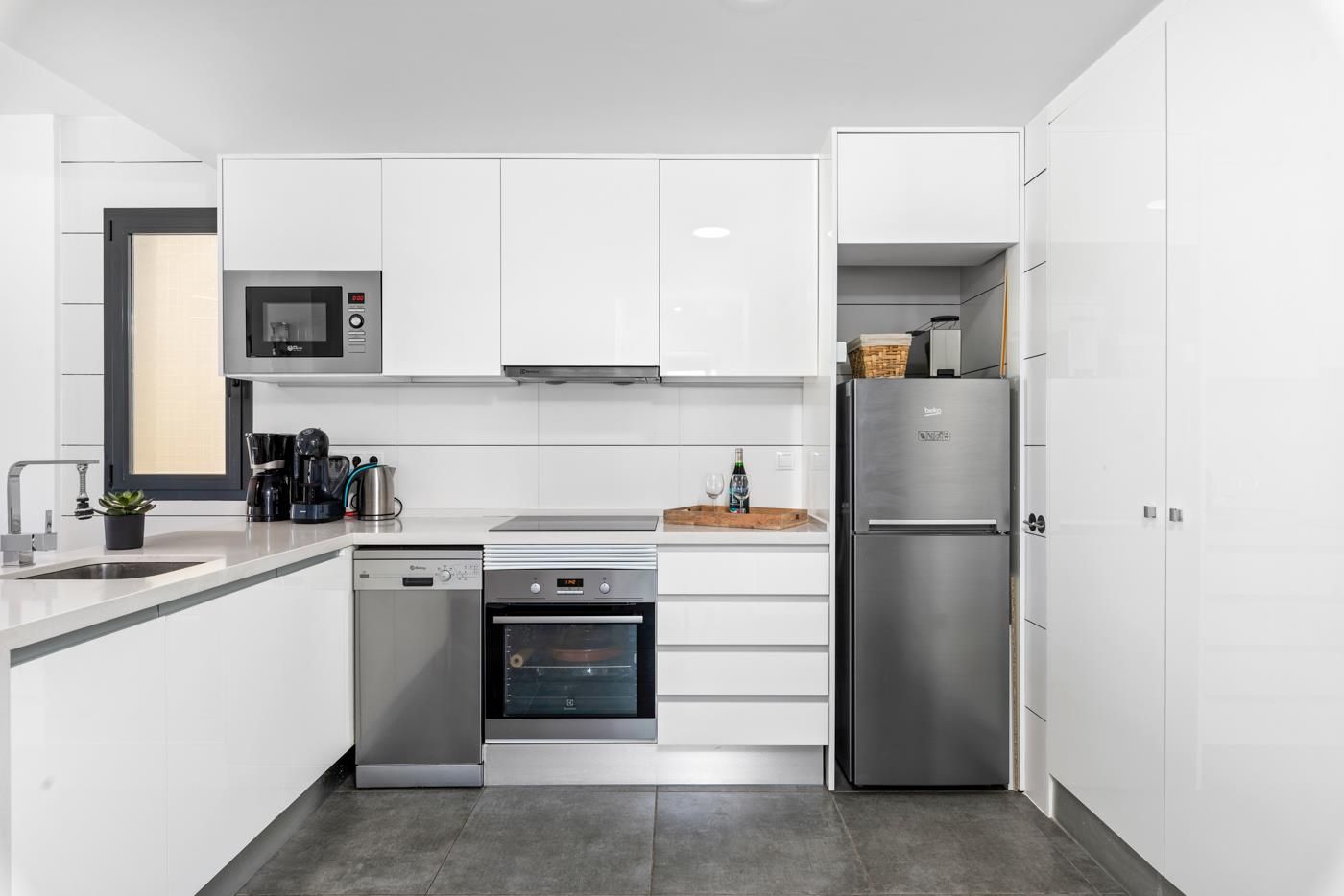 • cocina abierta con cocina eléctrica, horno eléctrico, microondas, lavavajillas, refrigerador-congelador, cafetera, tetera eléctrica y tostadora