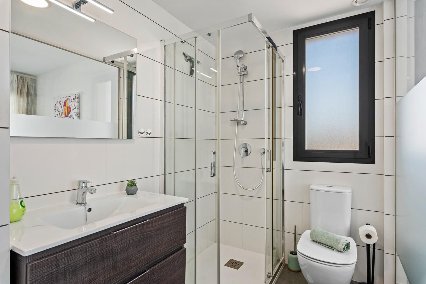 • baño en suite con lavabo individual, ducha, inodoro y secador de pelo