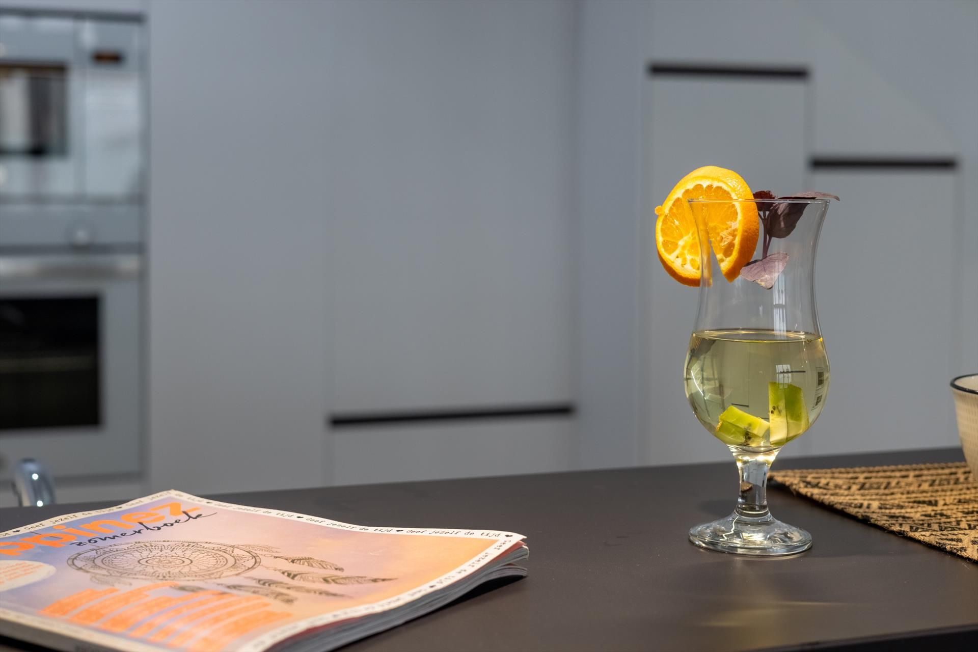 • open keuken met elektrische kookplaat, elektrische oven, vaatwasser, koelkast-vriescombinatie, koffiezetapparaat, waterkoker, mixer en broodrooster